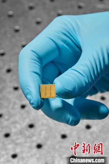 研究者手上拿著的14納米模擬AI芯片(圖片來自Ryan Lavine)。施普林格·自然  供圖