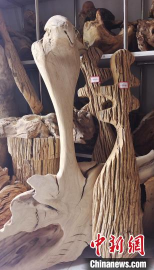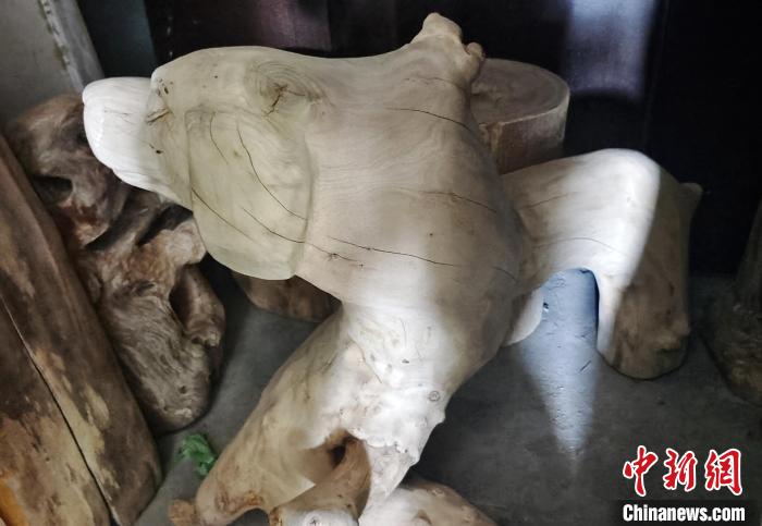 52歲的戴新是新疆生產(chǎn)建設(shè)兵團第一師十團苗木基地的技工,因長年癡迷于根雕藝術(shù),依靠當(dāng)?shù)囟鄻拥牧謽I(yè)資源制作各類根雕,不僅建起根雕廠,還利用閑置的房屋,分門別類設(shè)立了多間根雕展示廳。