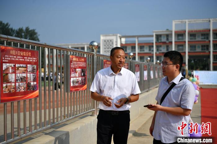 9月1日,涿州市刁窩中學(xué)校長(zhǎng)孫常見(左)向中新社記者講述“筑夢(mèng)路”背后的故事?!≈行律缬浾?翟羽佳 攝