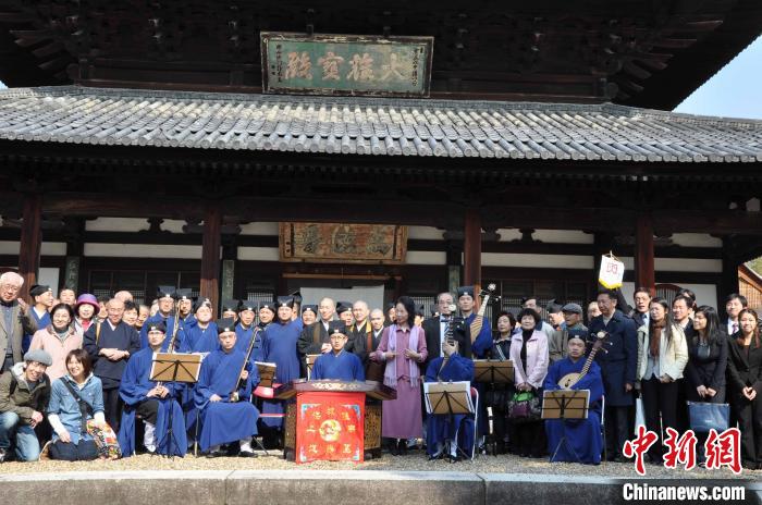2012年4月8日,上海城隍廟道樂(lè)團(tuán)與日本觀眾在萬(wàn)福寺大雄寶殿前合影?!?上海市道教協(xié)會(huì)供圖)