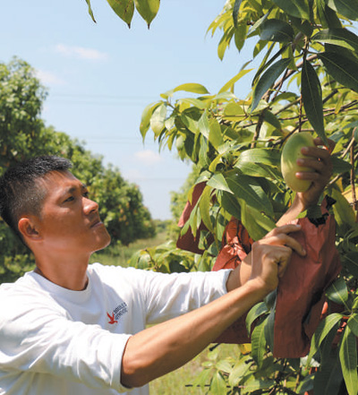 柬埔寨磅士卑省一個芒果園內(nèi),果園主管布南正在細致檢查芒果長勢。該果園生產(chǎn)優(yōu)質(zhì)芒果,遠銷至中國、俄羅斯、日本和韓國。