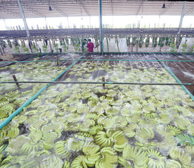 柬埔寨磅湛省的地澤香蕉園加工廠內(nèi),巨大的清洗池里滿是剛剛采摘下來的香蕉。這些香蕉將運往中國銷售。