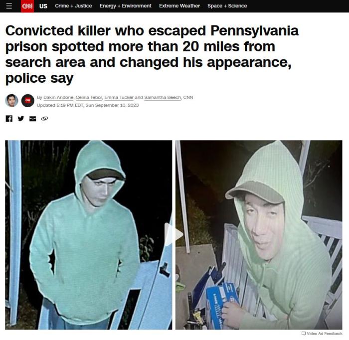 據(jù)賓州警方介紹,卡瓦爾坎特在逃跑中還曾聯(lián)系2位前同事,要求與其見面。截至當?shù)貢r間10日下午,警方尚不確定卡瓦爾坎特是否攜帶武器,但警方能夠確認他自越獄后曾進入幾棟住宅。尚不清楚他是否從這些地方拿走東西。
