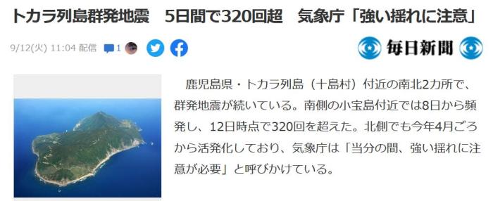 9月8日至12日,日本鹿兒島縣吐噶喇群島持續(xù)發(fā)生地震,5天內地震超320次。圖片來源:日本《每日新聞》報道截圖