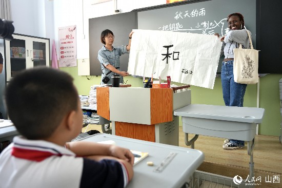 圖為莉迪亞給午亭小學三年級一班的同學贈送書法禮物。人民網(wǎng) 盧鵬宇攝
