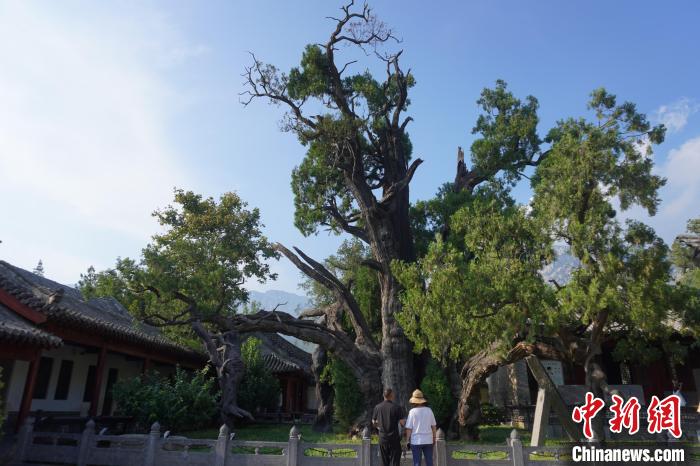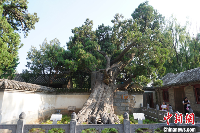 8月7日,河南登封,游客參觀嵩陽書院內(nèi)4500年樹齡的古柏。中新社記者 韓章云 攝