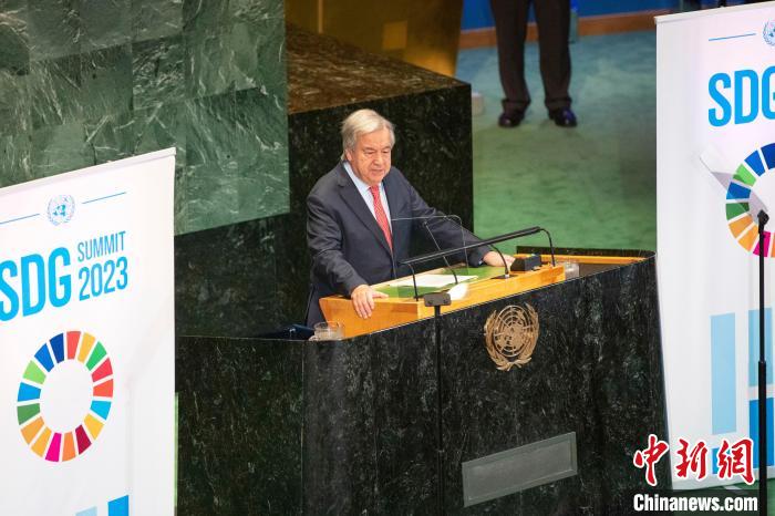 當(dāng)?shù)貢r(shí)間9月18日,聯(lián)合國(guó)可持續(xù)發(fā)展目標(biāo)峰會(huì)在紐約聯(lián)合國(guó)總部拉開帷幕。當(dāng)天,聯(lián)大通過(guò)一項(xiàng)政治宣言,會(huì)員國(guó)承諾加速實(shí)現(xiàn)2030年可持續(xù)發(fā)展目標(biāo)。圖為聯(lián)合國(guó)秘書長(zhǎng)古特雷斯發(fā)表講話?!≈行律缬浾?王帆 攝