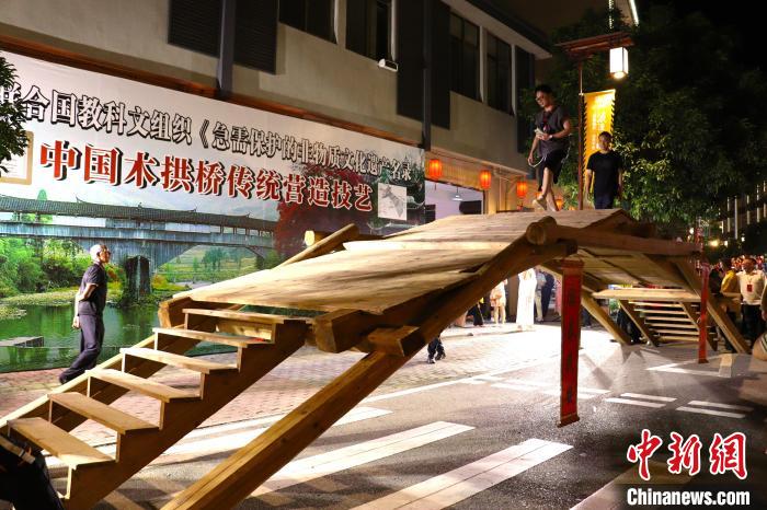 木拱廊橋傳統(tǒng)營造技藝展示現(xiàn)場,游客登橋行走。中新網(wǎng)記者 葉茂 攝
