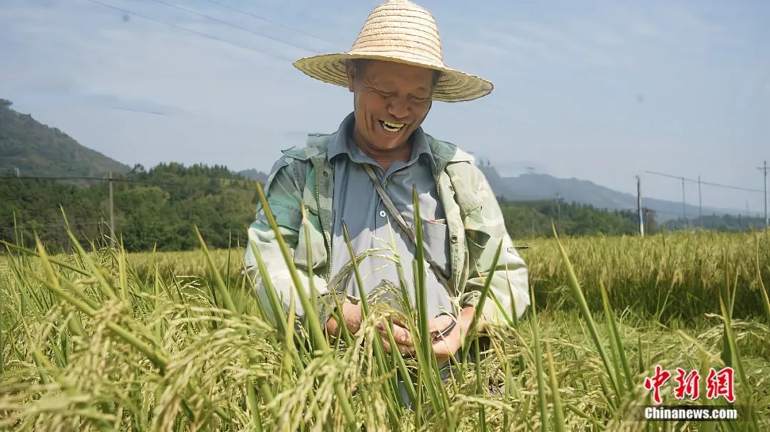 靖州縣制種大戶彭大林看著豐收的稻田笑得合不攏嘴。王璨 攝