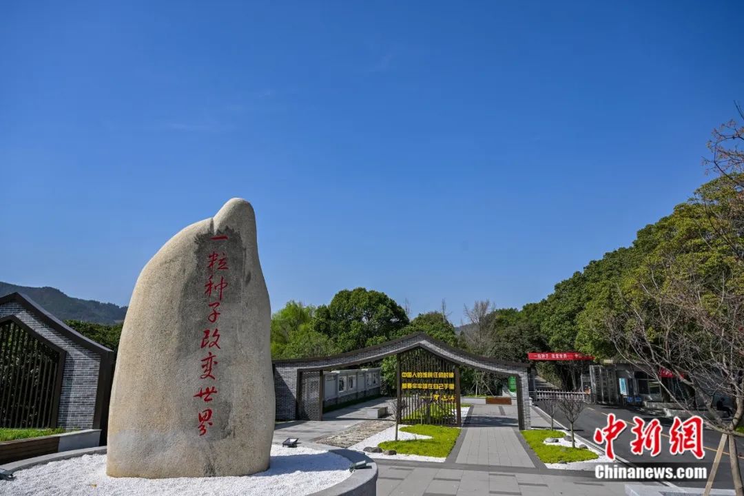 一顆標(biāo)有“一粒種子 改變世界”紅色大字的稻米石頭高高聳立在安江農(nóng)校紀(jì)念園門口。潘雨 攝