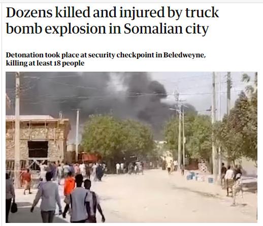 中新網(wǎng)9月24日電 據(jù)英國(guó)《衛(wèi)報(bào)》報(bào)道,索馬里當(dāng)局表示,當(dāng)?shù)貢r(shí)間23日,位于索馬里中部城鎮(zhèn)貝萊德文的一個(gè)安全檢查站發(fā)生爆炸,造成至少18人身亡、40人受傷。