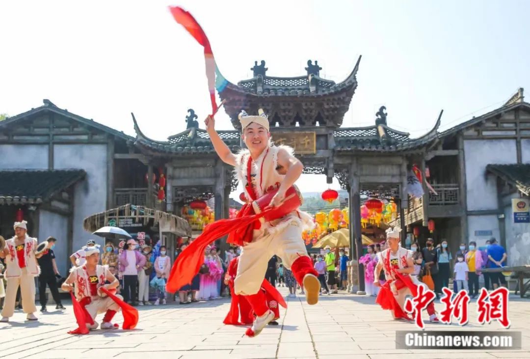 千華古村內(nèi)的“歡慶腰鼓”表演。鐘學滿 攝