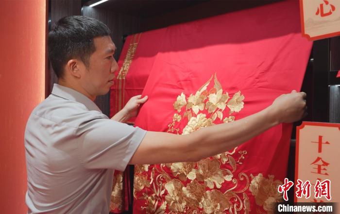 8月28日,“臺二代”、湖南富麗真金家紡有限公司總經(jīng)理杜俊毅在展廳整理產(chǎn)品。 楊世豪 攝