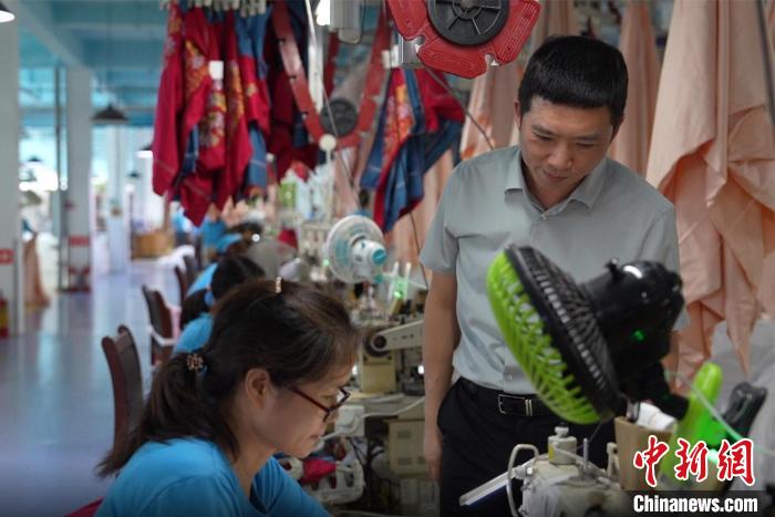 8月28日,“臺二代”、湖南富麗真金家紡有限公司總經(jīng)理杜俊毅(右)在車間與員工交流。 楊世豪 攝