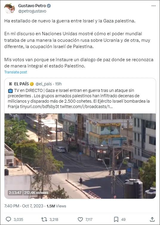 “以色列和巴勒斯坦在加沙地帶再次爆發(fā)戰(zhàn)爭(zhēng)。在聯(lián)合國(guó)的演講中,我曾展示了世界大國(guó)如何以一種方式對(duì)待俄羅斯對(duì)烏克蘭的占領(lǐng),但又以另一種截然不同的方式對(duì)待以色列對(duì)巴勒斯坦的占領(lǐng)。 ”佩特羅在社交媒體X發(fā)文說(shuō),“我支持建立和平對(duì)話,巴勒斯坦國(guó)將得到全面承認(rèn)。”