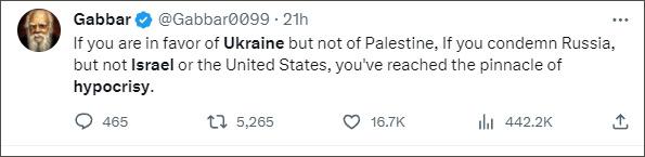 美國(guó)合眾國(guó)際社(UPI)報(bào)道注意到,有很多媒體專欄作者和社交媒體用戶都指出了西方在俄烏沖突等問(wèn)題上的“虛偽行為”,佩特羅并不是唯一一位。例如一名認(rèn)證為“作家”的社交媒體用戶寫道:“如果你支持烏克蘭而不支持巴勒斯坦,如果你譴責(zé)俄羅斯卻不譴責(zé)以色列或美國(guó),那么你就已經(jīng)達(dá)到了虛偽的頂峰?!?/p>