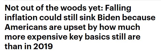 報(bào)道援引美國數(shù)字新聞網(wǎng)站(Axios)的民調(diào)稱,美國民眾對(duì)本國經(jīng)濟(jì)的看法十分糟糕。這其中很重要的原因就是,民眾在日常生活中更關(guān)注所需商品的絕對(duì)價(jià)格,而這一價(jià)格目前依然過高。盡管近期美國通脹率有所下降,但商品價(jià)格還在上漲,只是比以前稍慢了一些。