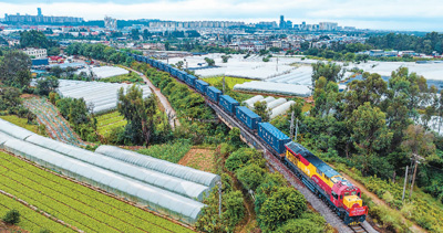 “滬滇·瀾湄線”國(guó)際貨運(yùn)班列開行首發(fā)儀式近日在云南省昆明市王家營(yíng)西集裝箱中心站舉行。滿載來(lái)自東南亞地區(qū)的水果、橡膠和白糖、金屬硅等產(chǎn)品的班列,駛向上海臨港新片區(qū)蘆潮港站。圖為“滬滇·瀾湄線”國(guó)際貨運(yùn)班列駛出王家營(yíng)西集裝箱中心站。