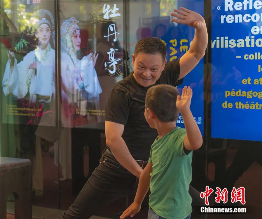 2023年9月,柯軍現(xiàn)場教授海外小朋友體驗昆曲一招一式。柯軍 供圖