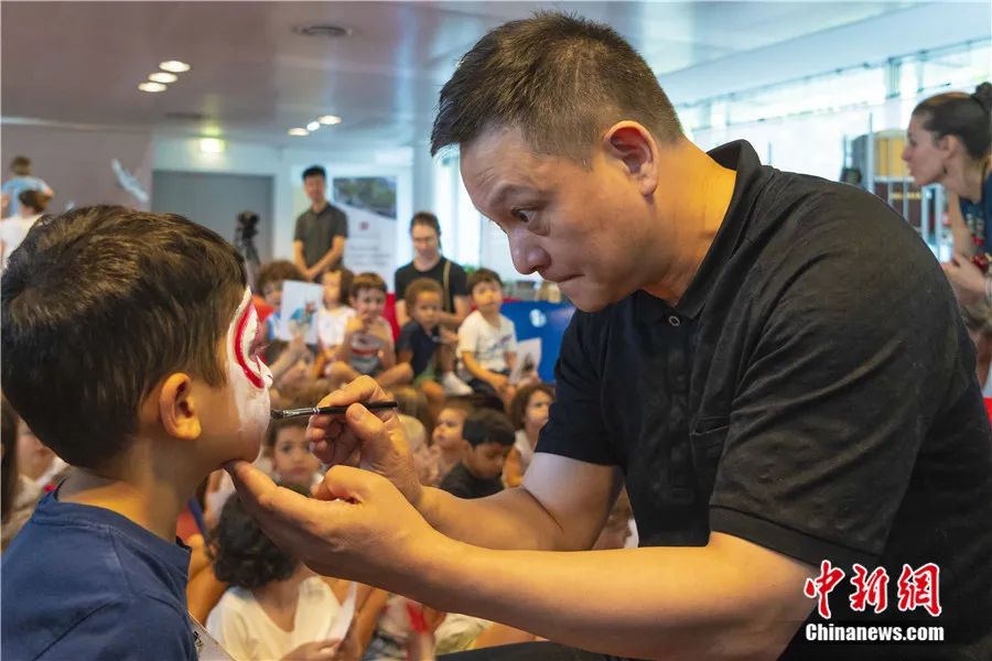 2023年9月赴法演出期間,昆曲走進當?shù)氐牟┪镳^、大學校園以及中國文化中心的工作坊。圖為柯軍帶領當?shù)貙W生體驗昆曲扮相??萝?供圖