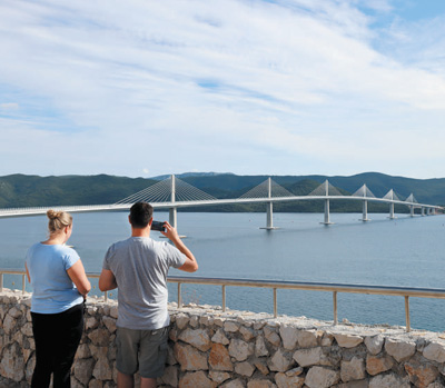 沿著克羅地亞狹長的海岸線一路向南行駛到科馬爾納地區(qū),遠(yuǎn)遠(yuǎn)就能望見如銀鏈般橫臥在山海之間的佩列沙茨大橋。在橋頭一側(cè)的休息區(qū),人們紛紛停下車來,對著大橋拍照留念。來自克羅地亞北部的卡塞爾和朋友們特地自駕來到這里,開心地請本報記者幫忙合影?!芭辶猩炒拇髽蜻B通了克羅地亞南北領(lǐng)土,是我們心中最美的大橋!”卡塞爾說。
