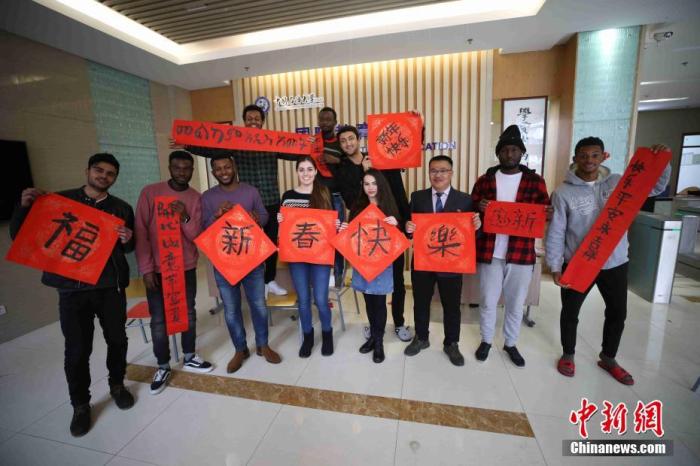 資料圖:2019年2月3日是中國(guó)農(nóng)歷臘月二十九,“春節(jié)”將至,來(lái)自巴基斯坦、烏茲別克斯坦、烏克蘭等國(guó)家和地區(qū)的十余名中國(guó)石油大學(xué)的留學(xué)生在青島歡聚一堂,一起寫(xiě)“春聯(lián)”、題“?!弊?、貼“窗花”,感受中華文化。中新社記者 胡耀杰 攝