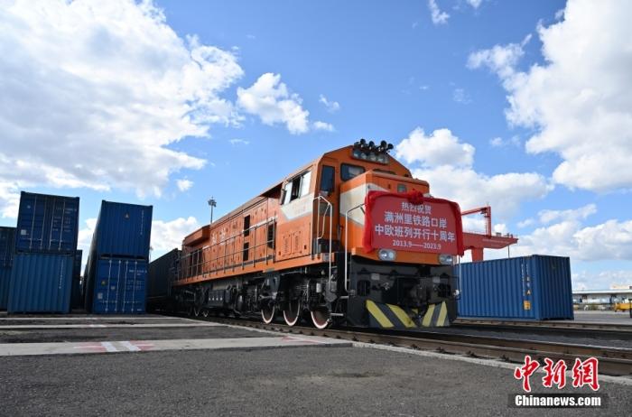 資料圖:2023年9月20日,在內(nèi)蒙古滿洲里站集裝箱場(chǎng),X8102次回程中歐班列,編組53輛,載滿板材、汽車(chē)配件、食品等貨品,開(kāi)往西安國(guó)際港。
