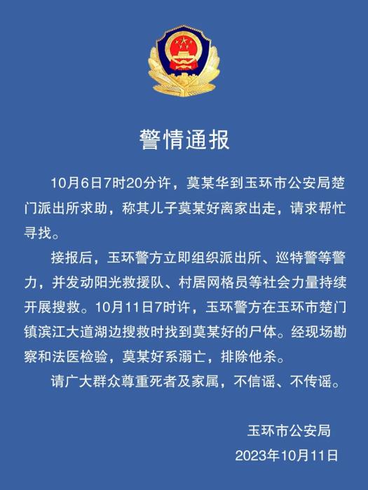 接報后,玉環(huán)警方立即組織派出所、巡特警等警力,并發(fā)動陽光救援隊、村居網(wǎng)格員等社會力量持續(xù)開展搜救。10月11日7時許,玉環(huán)警方在玉環(huán)市楚門鎮(zhèn)濱江大道湖邊搜救時找到莫某好的尸體。經(jīng)現(xiàn)場勘察和法醫(yī)檢驗,莫某好系溺亡,排除他殺。