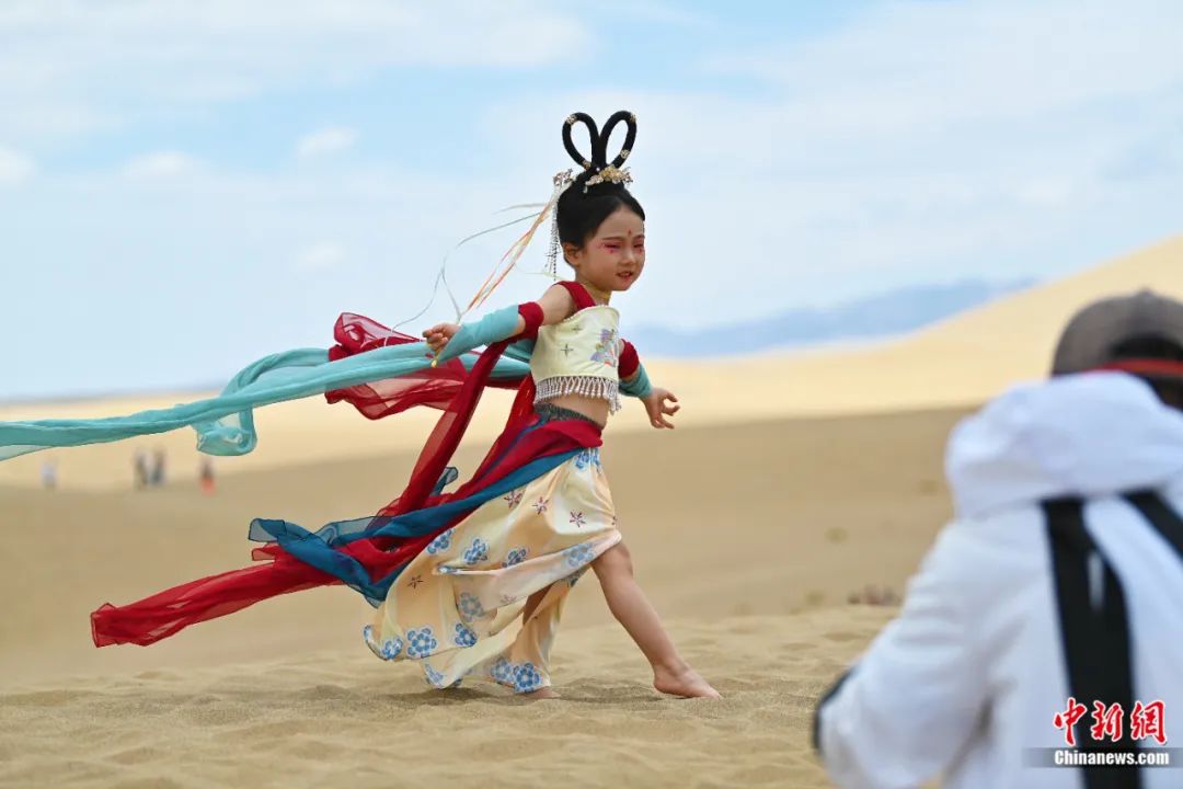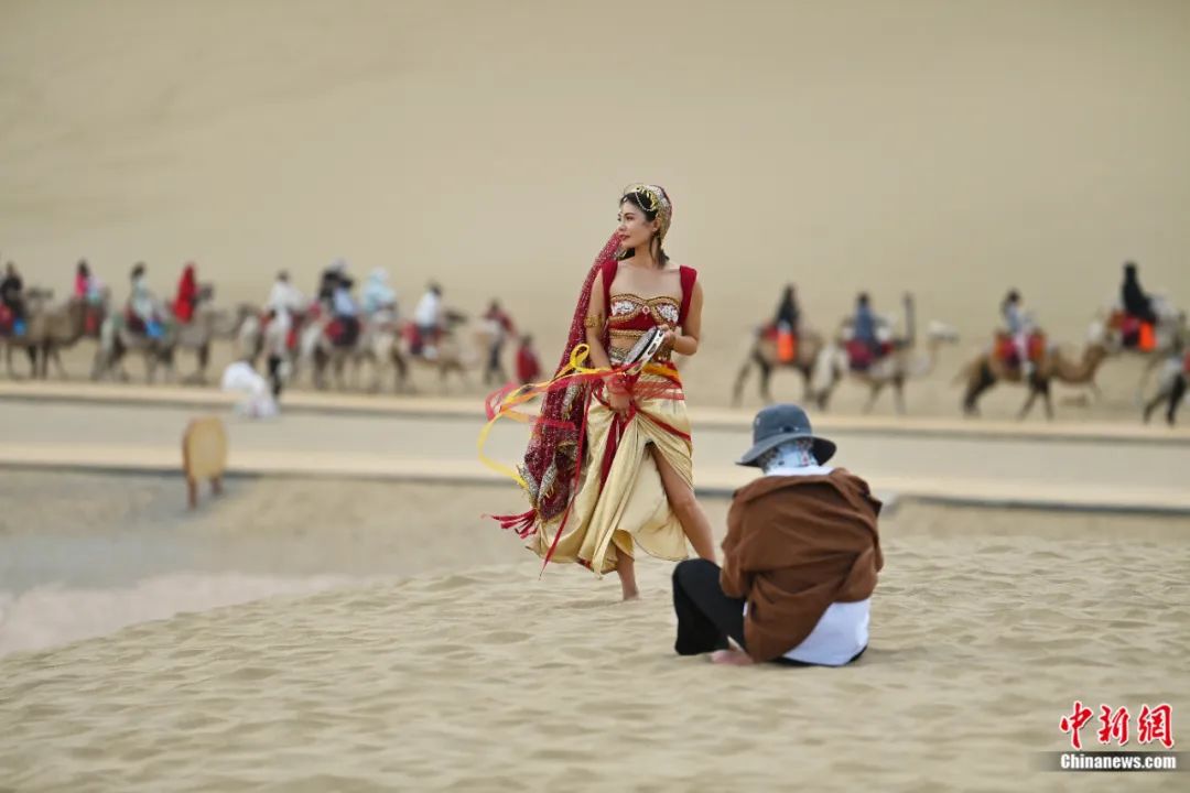 鳴沙山月牙泉景區(qū)內(nèi),游客身著西域服飾進行旅拍。中新社記者 李亞龍 攝