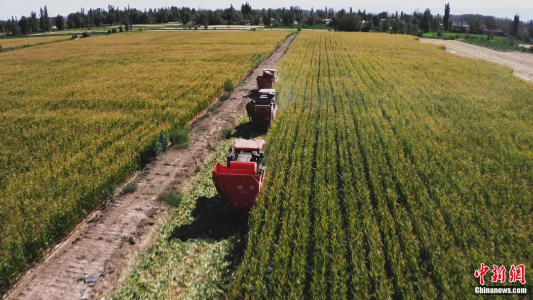 敦煌市莫高鎮(zhèn)新店臺村的高標準農(nóng)田里,收割機在田地里收割玉米。郭均強 攝