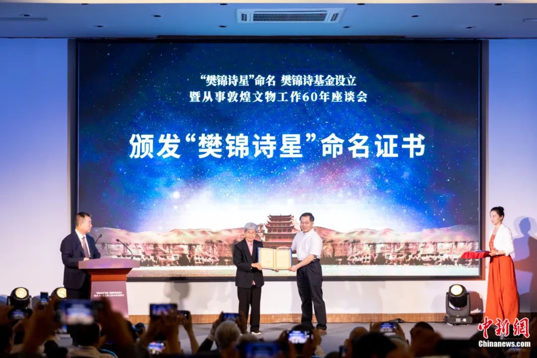 2023年7月10日,“樊錦詩星”命名、樊錦詩基金設(shè)立暨樊錦詩從事敦煌文物工作60年座談會在甘肅敦煌舉行。敦煌研究院供圖