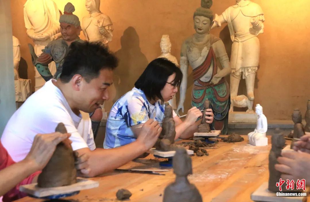 游客在敦煌莫高里工匠村學習制作木胎泥塑。張曉亮 攝