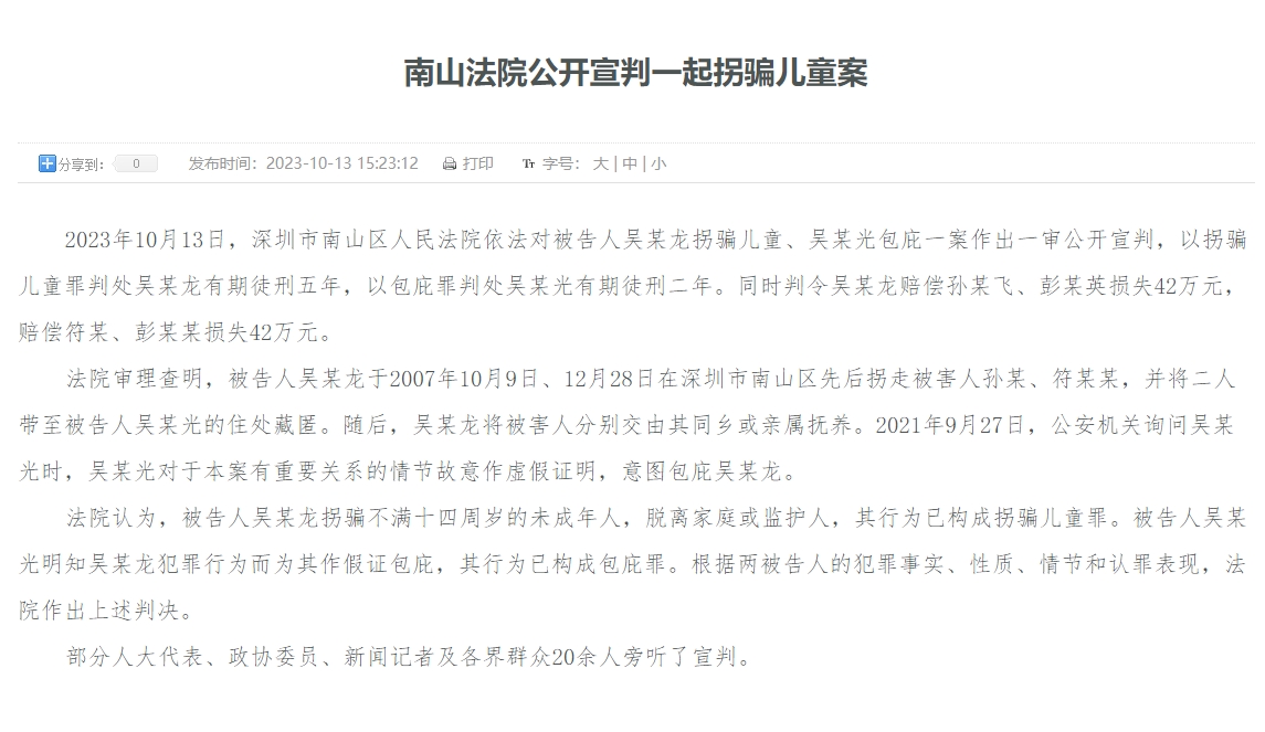 10月13日,深圳市南山區(qū)人民法院依法對被告人吳某龍拐騙兒童、吳某光包庇一案作出一審公開宣判,以拐騙兒童罪判處吳某龍有期徒刑五年,以包庇罪判處吳某光有期徒刑二年。同時判令吳某龍賠償孫某飛、彭某英損失42萬元,賠償符某、彭某某損失42萬元。