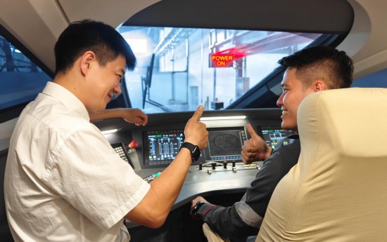 8月25日,在印度尼西亞萬隆的雅萬高鐵德卡魯爾動車所內(nèi),中國師傅穆振(左)在向印尼火車司機(jī)塞蒂亞萬講解動車組出庫前的上電作業(yè)。