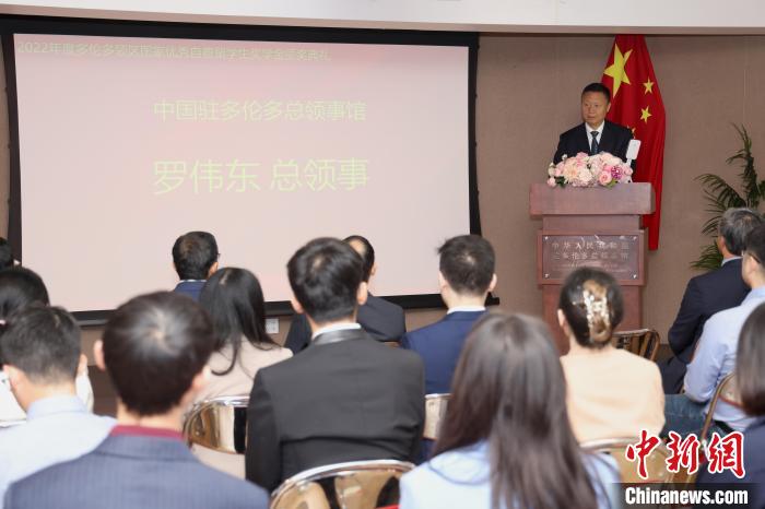 中國駐多倫多總領(lǐng)館10月21日為領(lǐng)區(qū)2022年度“國家優(yōu)秀自費留學生獎學金”獲得者頒獎。圖為中國駐多倫多總領(lǐng)事羅偉東在儀式上致辭。中新社記者 余瑞冬 攝