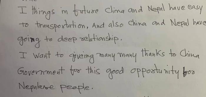 國(guó)之交在于民相親,民相親在于心相通。采訪過(guò)后,這位老人認(rèn)認(rèn)真真地用英文寫下一封信并交給中新網(wǎng)記者。他說(shuō):“我相信,未來(lái)中尼交通將更加便利,兩國(guó)情誼將更加深厚。我非常、非常地感謝中國(guó)政府,為尼泊爾人民帶來(lái)了這些大好機(jī)會(huì)?!?/p>