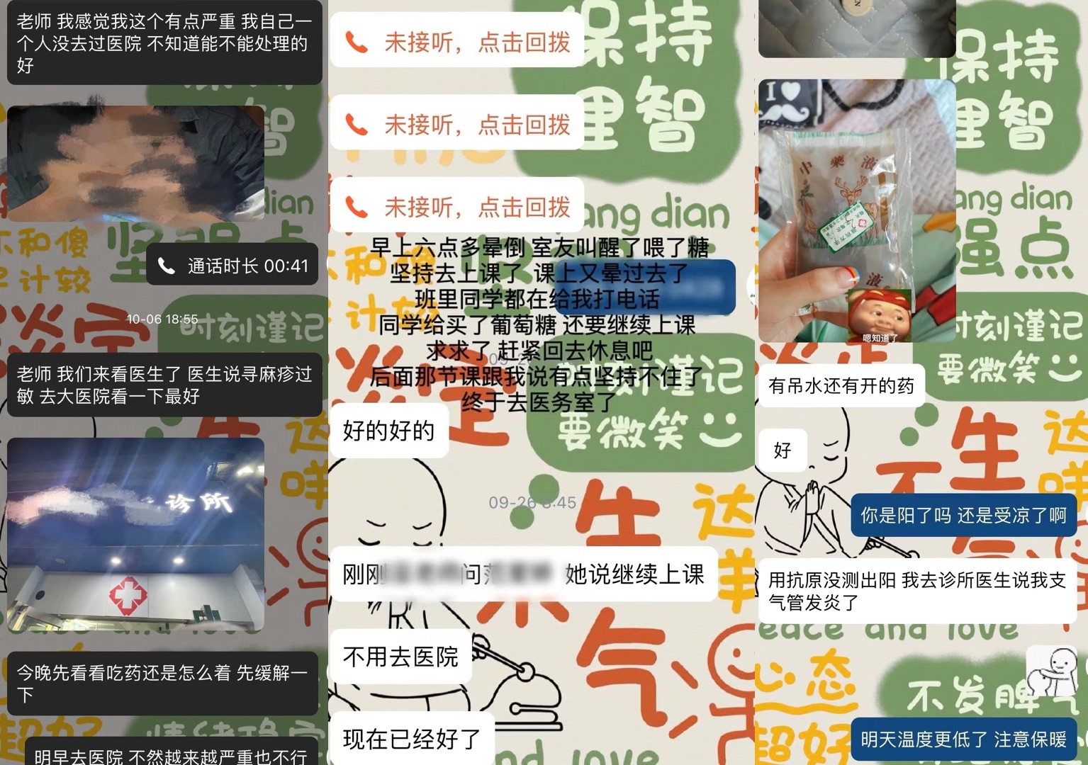 “因?yàn)槲規(guī)У膶W(xué)生基數(shù)較大,三百多人,每周基本上都會(huì)有十幾個(gè)因生病請(qǐng)假的學(xué)生?!?阿宛向中新網(wǎng)介紹,生病的學(xué)生中,最常見的是感冒發(fā)燒、胃疼等情況,也有一些突發(fā)狀況,比如“著急下樓收衣服結(jié)果被垃圾車刮到,半夜嘔吐到進(jìn)醫(yī)院,低血糖在課上暈倒”等。
