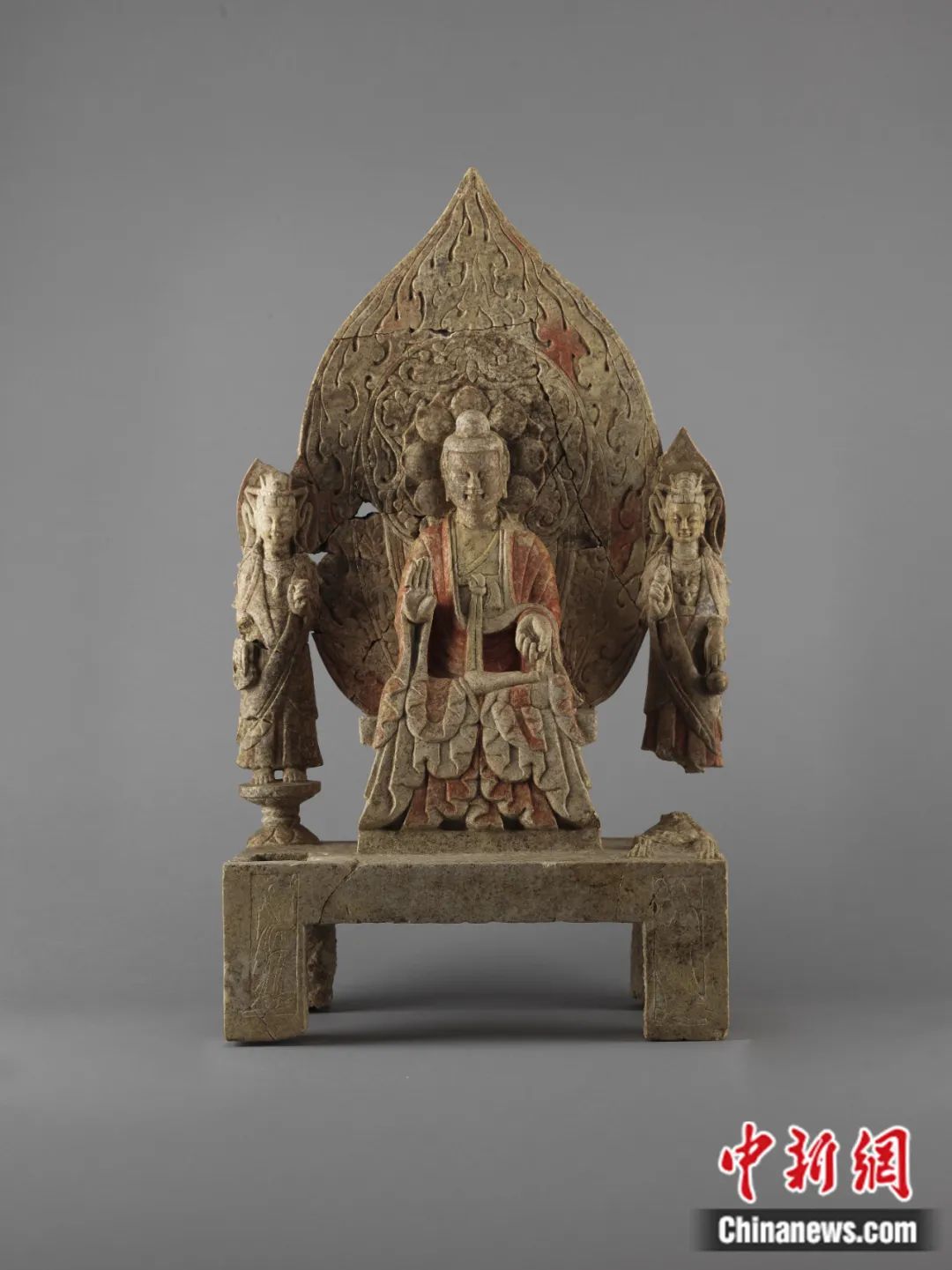 何利群:“譚副造釋迦像”殘高1.28米,主尊高77.7厘米,青石材質(zhì),是一尊一佛二菩薩背屏式造像,通體彩繪貼金。它由數(shù)十件碎塊拼接綴合而成,是鄴城地區(qū)出土時代最早的北魏造像之一,也是其中形體較大的一件。