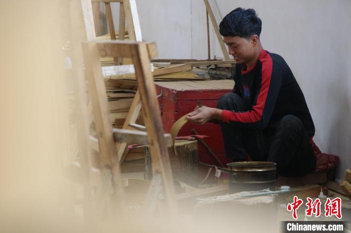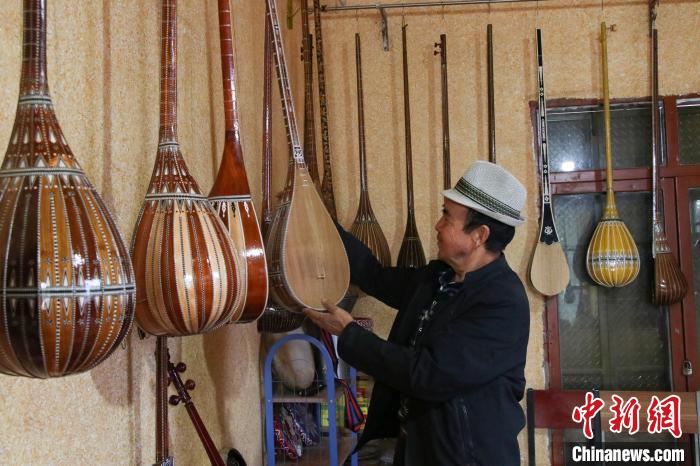 10月15日,新疆阿克蘇地區(qū)新和縣依其艾日克鎮(zhèn)加依村樂器制作匠人努爾冬·司馬義在檢查手工制作的樂器。茍繼鵬 攝