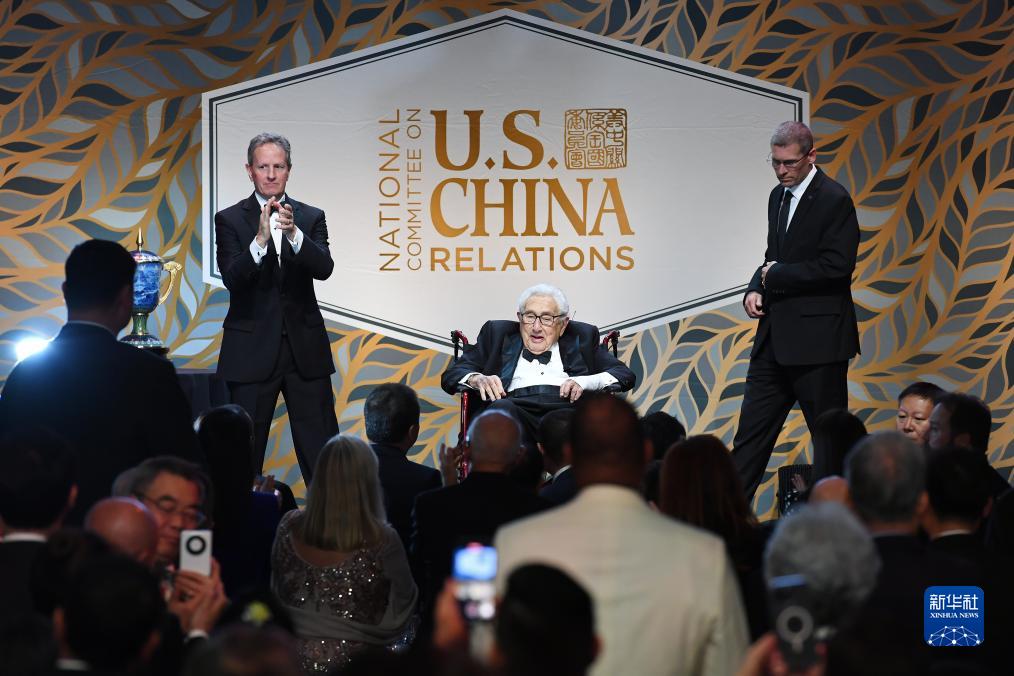 10月24日,美國前國務(wù)卿基辛格(中)出席在紐約舉行的美中關(guān)系全國委員會年度頒獎晚宴。新華社記者 李睿 攝