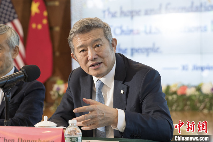 當(dāng)?shù)貢r(shí)間10月25日,參加清華大學(xué)和美中關(guān)系全國(guó)委員會(huì)共同舉辦的“中美民眾對(duì)話”活動(dòng)的部分代表來(lái)到中國(guó)駐紐約總領(lǐng)事館,就中美經(jīng)貿(mào)關(guān)系、科研合作、人文交流等回答記者提問(wèn)。被問(wèn)及中國(guó)企業(yè)在美國(guó)投資的相關(guān)問(wèn)題時(shí),泰康保險(xiǎn)集團(tuán)董事長(zhǎng)陳東升表示,貿(mào)易和投資對(duì)中美關(guān)系十分重要。在美國(guó)投資,比如康復(fù)醫(yī)療是一個(gè)大的合作方向,我們歡迎美國(guó)的企業(yè)來(lái)合作,這是互利互惠的過(guò)程。 中新社記者 廖攀 攝