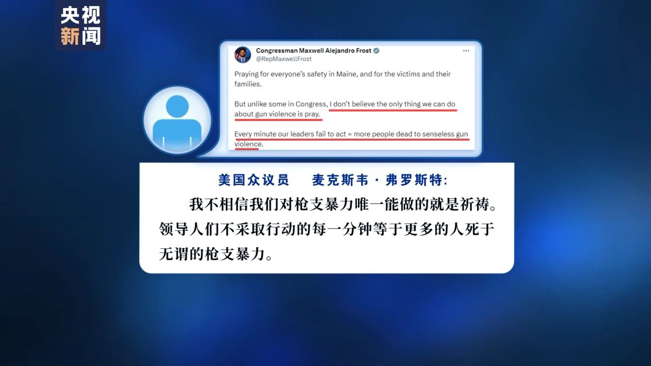 此外,每次槍擊案發(fā)生后,美國擁槍派政客都重復著空洞的安慰,這次也不例外。在多位擁槍派政客的社交媒體上,各種口頭安慰和無力的陳詞濫調比比皆是。對此,美國眾議員麥克斯韋·弗羅斯特(Maxwell Alejandro Frost)發(fā)推文寫道,“我不相信我們對槍支暴力唯一能做的就是祈禱。領導人們不采取行動的每一分鐘等于更多的人死于無謂的槍支暴力。”
