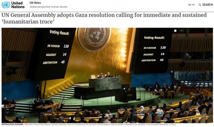 據(jù)聯(lián)合國(guó)網(wǎng)站消息,紐約當(dāng)?shù)貢r(shí)間27日下午,第78屆聯(lián)大以125票贊成、14票反對(duì)和45票棄權(quán)的表決結(jié)果,通過(guò)了由約旦代表阿拉伯國(guó)家集團(tuán)提交的一份聯(lián)大決議草案。