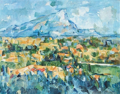 由此,塞尚、梵高、高更等藝術(shù)家的繪畫語(yǔ)言逐漸展現(xiàn)出不同于印象派的風(fēng)格。塞尚在繪畫中拋棄了明暗和透視,尋求色彩與形狀的互相牽制,使畫面結(jié)構(gòu)更加穩(wěn)定嚴(yán)謹(jǐn),制造出物與物之間的空間張力。他的油畫作品《圣維克多山》(見(jiàn)圖,曲音供圖)用冷暖色搭配勾勒出許多幾何形狀的色塊,形如房屋、狀似樹木,以相互交疊的視覺(jué)呈現(xiàn)替代了透視效果,暗示出遠(yuǎn)近和前后關(guān)系,令畫面中的山峰無(wú)論從哪個(gè)角度觀看都顯得雄偉壯麗。
