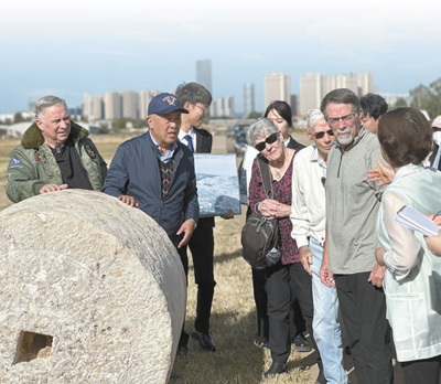 在云南昆明呈貢機場舊址,代表團一行聆聽講解員講述石碾背后的故事。呈貢機場曾是飛虎隊在昆明的主要基地之一,機場建設期間,當?shù)厝嗣窭瓌泳薮笫肫秸艿?,付出艱苦努力。