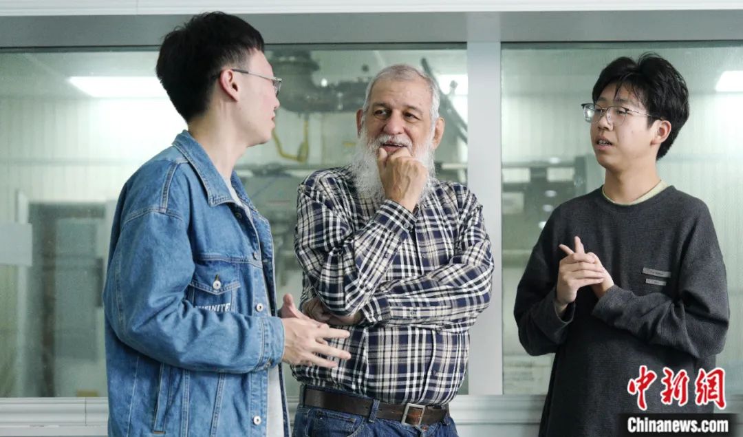 2023年11月,利用實驗室午間休憩間隙,裴德樂在電子科技大學(xué)接受了中新社“東西問”采訪。身著紅色衛(wèi)衣、藍色牛仔褲的裴德樂精神矍鑠,言語間中氣十足。