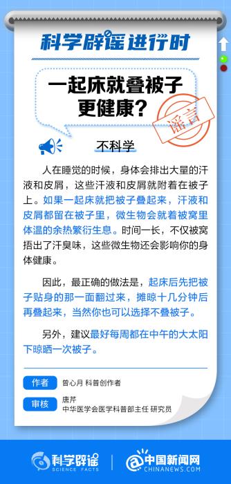 中新網(wǎng)11月17日電 人在睡覺的時候,身體會排出大量的汗液和皮屑,這些汗液和皮屑就附著在被子上。如果一起床就把被子疊起來,汗液和皮屑都留在被子里,微生物會就著被窩里體溫的余熱繁衍生息。時間一長,不僅被窩捂出了汗臭味,這些微生物還會影響你的身體健康。(來源:@科學(xué)辟謠 @中國新聞網(wǎng) )