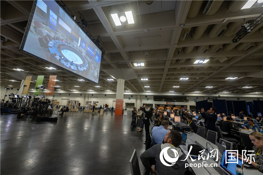 當(dāng)?shù)貢r(shí)間11月16日,美國(guó)舊金山,在APEC國(guó)際媒體中心,媒體記者忙碌工作。
