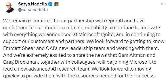 據(jù)路透社20日報道,微軟CEO納德拉在社交媒體上發(fā)文稱,微軟仍然致力于與OpenAI的合作,并期待了解希爾領(lǐng)導(dǎo)的新團隊。同時納德拉宣布,阿爾特曼、OpenAI前總裁格雷格·布羅克曼及其同事將加入微軟,領(lǐng)導(dǎo)一個新的高級人工智能研究團隊。微軟期待著迅速采取行動,為其成功提供所需的資源。