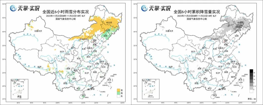實(shí)況數(shù)據(jù)顯示,今天白天,內(nèi)蒙古中東部以及東北地區(qū)大部都出現(xiàn)了雨雪天氣,其中,內(nèi)蒙古中東部、黑龍江中南部一帶以降雪為主,吉林、遼寧等地以降雨為主;黑龍江最強(qiáng)降雪集中在哈爾濱,尚志6小時降雪量超10毫米,達(dá)到暴雪以上量級。